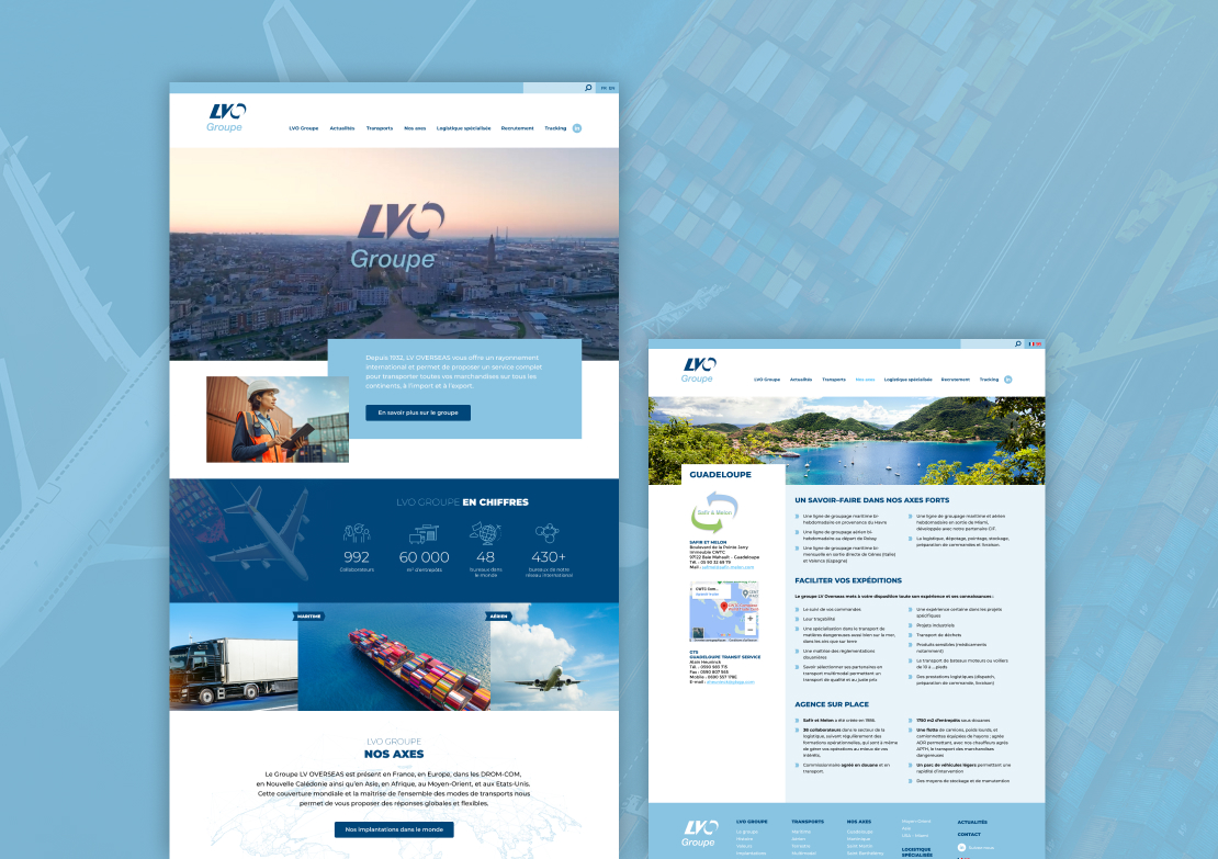 LVO Groupe (Léon Vincent Overseas) est un acteur international du transport et de la logistique, spécialisé dans l’affrètement, le transport multimodal et le dédouanement. J’ai assuré un accompagnement digital global, en partenariat avec l’agence LIZIWEB, incluant la conception UX/UI du site web, la création de la charte graphique du groupe, ainsi que le design de supports numériques : publications pour les réseaux sociaux, présentations PowerPoint et outils de communication digitaux.